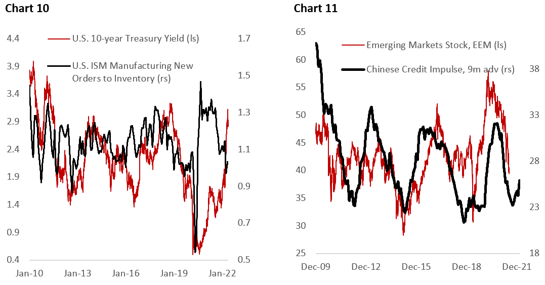 Meanwhile, U.S. Treasuries, trading at slightly below 3% level, are now very attractive from a cycle and valuation perspective. Inflation is showing some moderation in categories that are directly affected by the pandemic, and high base effect from last year means it has likely peaked in April. Following the planned 50 bps hike in the following two meetings, the Fed will likely take a more measured pace in tightening further (Chart 10). With QT ongoing, the risk of further riot in risk assets could not be ruled, which should benefit Treasuries.