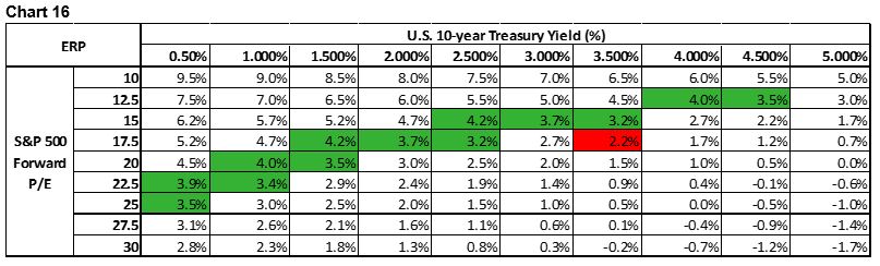 Given that we think equity risk premium has to rise above 4% for risk assets to reach bottom in this cycle, either yields have to fall drastically or multiple has to decline further (Chart 16). In our base case, consistent with our expectation for bonds to rally from current level and equities to correct by double digit, we expect a fall in 10-year Treasury yield to 2.5-3% and S&P 500 forward P/E to 15 times or below. If inflation prove to be sticky even as growth slumps in Q4/22 and Q1/23 and the Fed being forced to hold interest rate above 4.5%, equity multiple will likely fall below 13 times. This is our worst-case scenario. Either way, the outlook for bonds is much more favorable than for equities, at least for the next 3-6 months.
