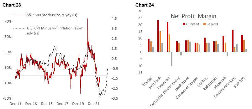 Our target for S&P 500 forward P/E of 14-15 times is based on deteriorating liquidity condition that should prick the bubble in high-multiple stocks with poor cash flow generation ability (Chart 21). Liquidity should continue to worsen in the coming quarters as the lagged impact of previous rate hikes and quantitative tightening takes effect. Meanwhile, leading indicators, such as growth tax, are indicating that earnings will fall by at least 10%. This is consistent with the high likelihood for S&P 500 margin to fall to 11.5% from 13% currently amid input cost pressure (Chart 22).