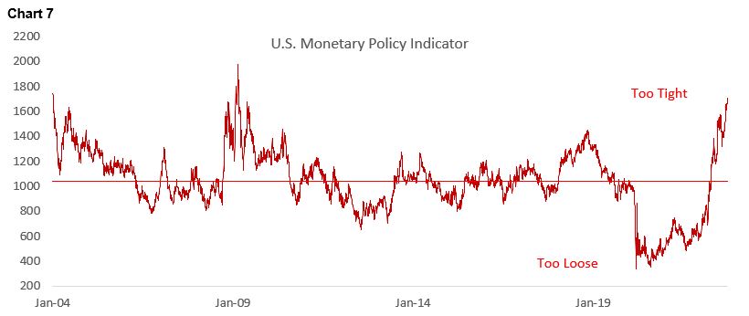 - Inflation expectations have remained anchored and is trending lower as the Fed tightens monetary policy (Chart 6). The 10-year inflation breakeven rate is currently trading at 2.34%, which is significantly below 2.8% in May but is still above the 2% average seen prior to the pandemic. We think long-term inflation breakeven needs to come down below 2% for the Fed to end the tightening cycle, which would also highlight market’s worry about future growth. At that point in time, risk assets should have fallen significantly, and growth will likely be under 1%.