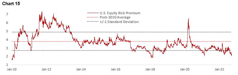 Since early this year we have warned that U.S. equities are overvalued and that slowing growth and tightening monetary policy would bode poorly for both multiple and earnings. Six months forward, the S&P 500 is 20% lower but surprisingly equity risk premium (ERP) has fallen even further to 2.2%, significantly below historical average of 3.8% (Chart 15). This is because 10-year Treasury yield has also risen from 2.3% at the end of March to 3.6% today. Unless yields start to fall, meaning that the Fed soften its stance towards policy tightening, the pain for equities will continue as growth deteriorates into 2023.