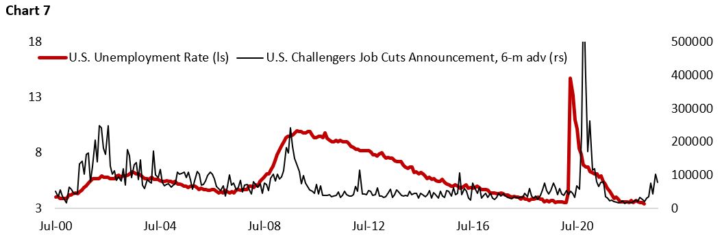 Already we are seeing early signs of cooling in labor demand in the January and February labor data. First, demand for part-time workers, which tend to adjust faster to the business cycle, is lower than the previous year. Chart 6 shows that change in demand for part-time employees has consistently led the direction of change in headline employment by 6 months (Chart 6). Second, we also expect that not only new demand for workers to cool, but businesses will also accelerate their effort to trim the fat in their operation. Challenger data points to a rise in unemployment rate in the coming two quarters (Chart 7).
