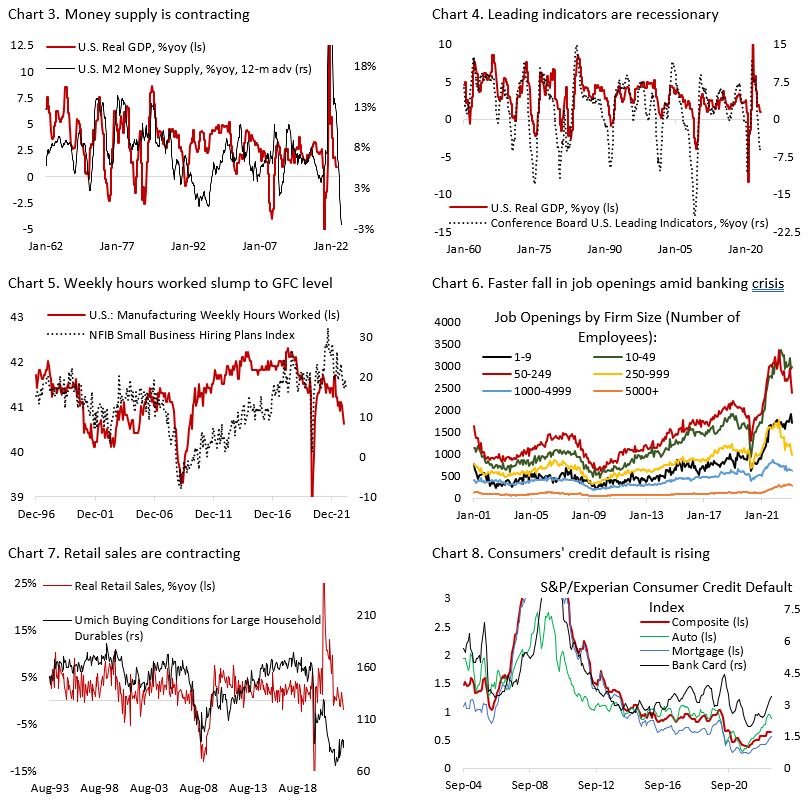I think the quote above sums up beautifully the blind spot we and other strategists may have amid the current late phase of the business cycle. After all, few, if any, analysts were expecting the U.S. regional banking mini crisis in March. Banking analysts have argued for years that stringent regulation and capital buffer following the global financial crisis have made banks’ balance sheet and liquidity condition much more robust. And yet, interest rate risk – the basic function of a banking system – turned out to be primary factor that drove the collapse of Silicon Valley Bank.