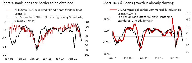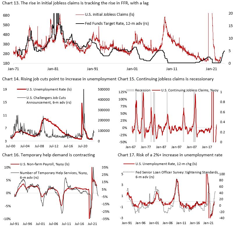 - First, initial jobless claims have been trending higher and consistently follows the historical 12-month lag of the change in policy rate (Chart 13). Given the rapid increase in interest rate over the past one year, the rise in jobless claims in the coming year may also be faster than historically had been the case.