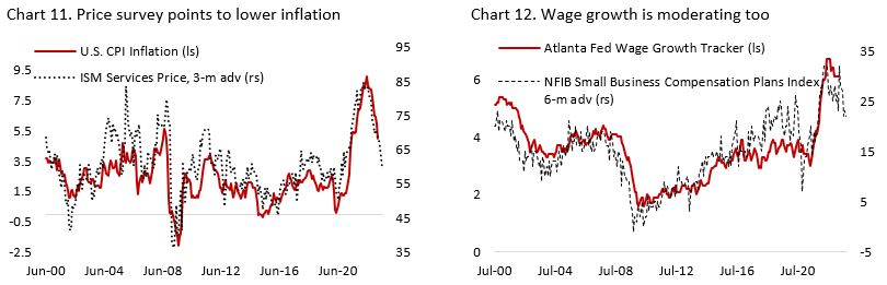 One macro variable that we are more constructive on relative to the consensus is inflation. Raw material prices and PPI inflation have continued to fall in recent months, which should continue to weigh headline CPI inflation lower. In addition, the price component in ISM service survey has fallen in a straight-line fashion and currently points to a decline in headline CPI inflation closer to 3% in the coming months (Chart 11). A weaker labor market condition and moderation in wage growth should also prevent core service inflation from rising significantly from current level, although timing the exact month it would peak is a difficult game to play (Chart 12).