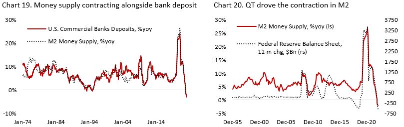 The first and probably greatest risk still relates to the drain of liquidity in the banking and financial system, which partially caused U.S. regional banking crisis back in March. Money supply has been contracting alongside bank deposits (Chart 19), driven by Fed’s quantitative tightening (Chart 20). With money market rate being significantly above bank’s deposit rate, a slow burn on bank deposit could not be ruled out, especially as businesses may also draw their cash balance to fund their operation. Tighter liquidity and more expensive borrowing should also prevent activity in the private space from rebounding strongly, especially related to commercial real estate. Capital fundraising has fallen double-digit amid start-ups and managers not wanting to raise capital at a lower valuation, hence realizing the losses in their portfolio. On the public market side, tighter liquidity conditions should deflate the rich valuation of mega-cap tech stocks. For reference, NASDAQ composite index is currently trading at 3.2x sales (historical range: 1.5-3x) and EV/EBITDA of 14.4x (historical range: 6-13x).