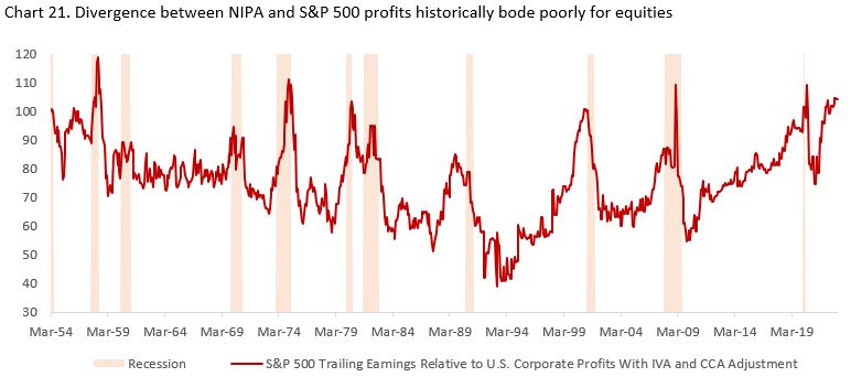 Our third worry is related to the accounting shenanigans commonly found during recession. The divergence between national income and product accounts (NIPA) profits and S&P 500 earnings has been widely discussed, with the latter potentially inflating the “true” earnings picture through various accounting methods. Chart 21 shows the ratio between S&P 500 trailing earnings relative to NIPA corporate profits in the U.S., rebased to 100 at March 1954. A rise of this ratio above the 100 level has historically coincided or followed by a recession, and by the end of Q4/22 the level is at 104.