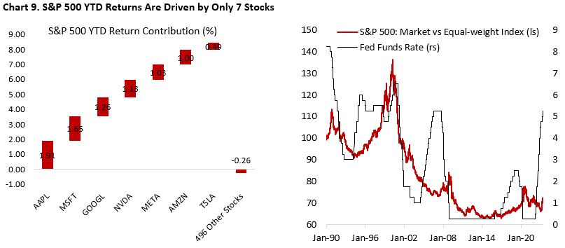 The combination of strong service sector, tight labor market, and less-than-expected decline in liquidity have supported the performance of U.S. stock indices this year, although the average stock has done much poorly than the mega-cap tech stocks. The biggest theme for U.S. equity this year has been the massive outperformance of the latter relative to the rest of the U.S. stock universe. Looking at S&P 500 YTD returns, only seven stocks explain the positive performance of the index, with the rest 496 stocks falling 0.26% (Chart 9). This reminds us of the late 1990’s when several tech names were leading the bull market in S&P 500 and Nasdaq Composite – supercharged by the policy rate cut amid LTCM collapse and Russian default.