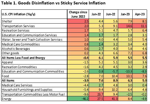 Looking at the core measure, which strip out food and energy, the decline in inflation has been driven by the goods sector. Inflation on new and used cars, auto parts, electronics, household appliances, and furniture have all eased (Table 1). This should not be a surprise given that consumers have pulled forward their spending for these categories of goods during the pandemic.
