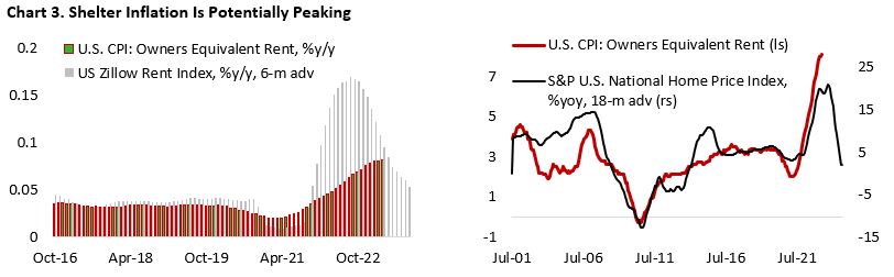 However, the battle on inflation has yet to be won, with the focus now shifting towards the service sector, in which shelter has the largest weight. Encouragingly, we are seeing potential peak in shelter inflation, as indicated by the rolling over of Zillow rental price index and deterioration in housing sector sentiment last year (Chart 3). Continuation of the decline in shelter price inflation should weigh the headline and core figure in the coming months.