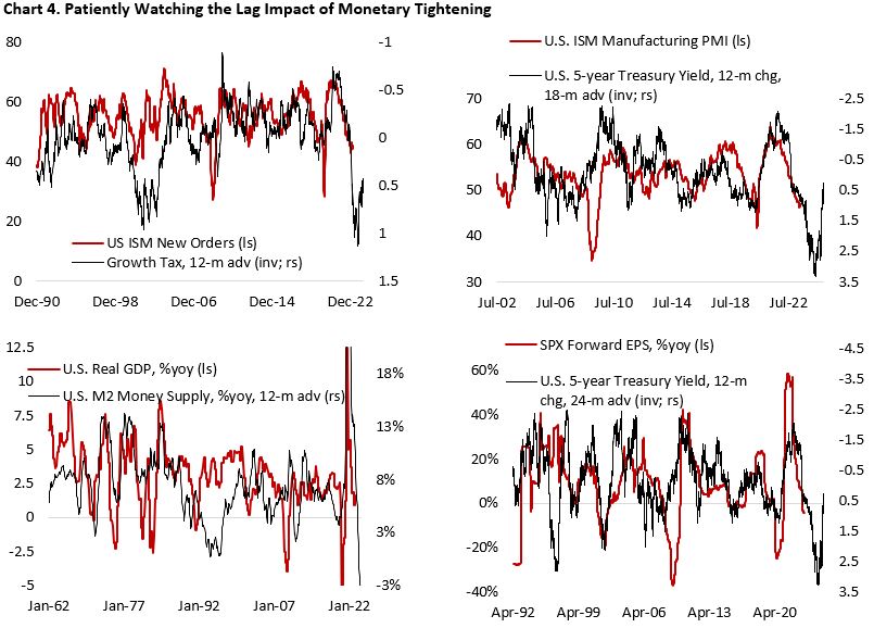 Despite all these, our bias for yields remains tilted to the downside as recession risks are still elevated. As highlighted in May FOMC when discussing factors that could weigh on future policy decisions, participants cited, “the degree and timing with which cumulative policy tightening restrained economic activity and reduced inflation, with some participants commenting that they saw evidence that the past years’ tightening was beginning to have its intended effect.” We have been saying this since last year, pointing to a 12–24-month lag historically between the time Fed started raising policy rate and the economic data showing obvious signs of slowdown in consumer spending and labor market weakness. Given that the Fed started to raise policy rate in March 2022 in this cycle, the bulk of the tightening will be felt around the second half of this year (Chart 4). Interestingly, we did have a mini crisis on U.S. regional banks back in late March, where the underlying issues have yet to be resolved completely.