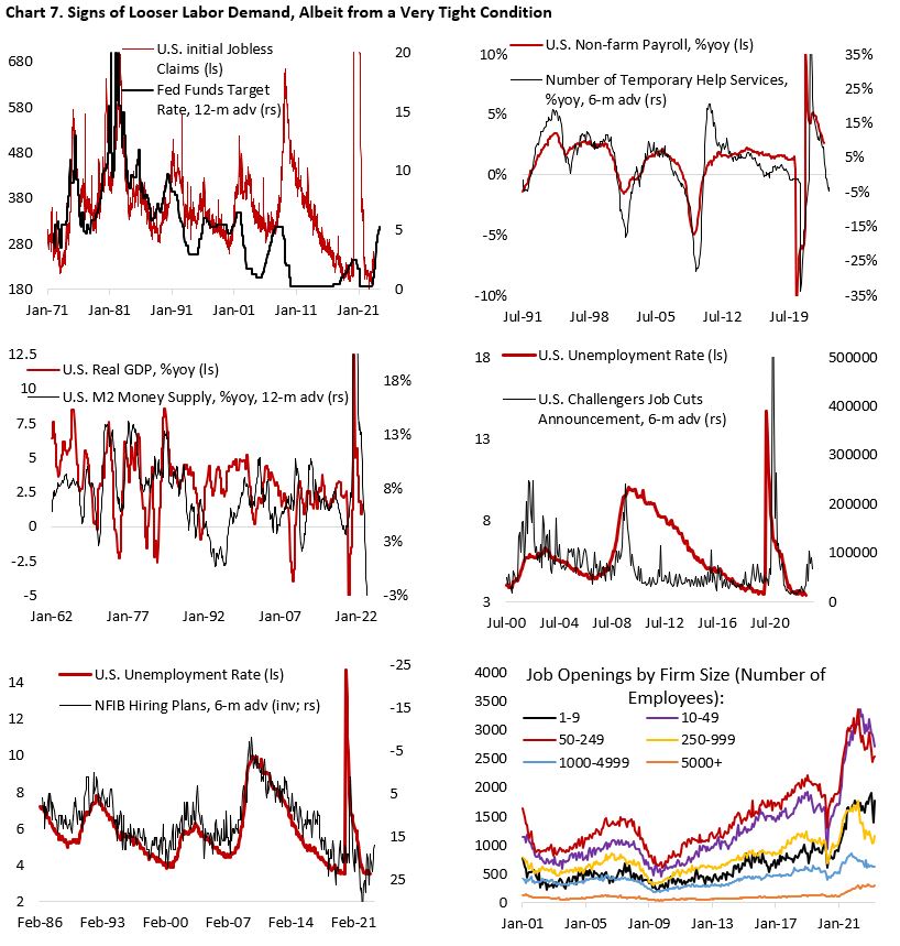 Not all the data, however, is pointing to the outlook of a strong labor market. Both initial and continuing jobless claims are on the rise, albeit from a very low level, and increasing number of companies are laying off their workers (Chart 7). Meanwhile, soft data continue to point to further cooling in the labor market. NFIB small business hiring plan is at the lowest level post-pandemic and job openings by firms with 1-249 employees have seen material decline in past few months, despite a tick higher in April. Given the fact that small businesses are more reliant on banks, the recent regional banking crisis will limit their access to financing and increase borrowing cost. These should act as a headwind to their expansion plan, especially if macro uncertainty persists. In sum, the labor market should continue to loosen.