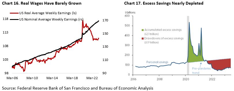 On the income and asset side, Chart 16 shows real wage has barely grown relative to pre-pandemic level despite the decline in inflation and strong nominal wage growth. Meanwhile, excess savings are estimated to have decline to $190 Bn in June from $2 Tn peak during the pandemic, according to Federal Reserve Bank of San Fransisco (Chart 17), and wage inflation is expected to continue to decline amid easing demand from the corporate side – both of which will put a lid on consumer spending.
