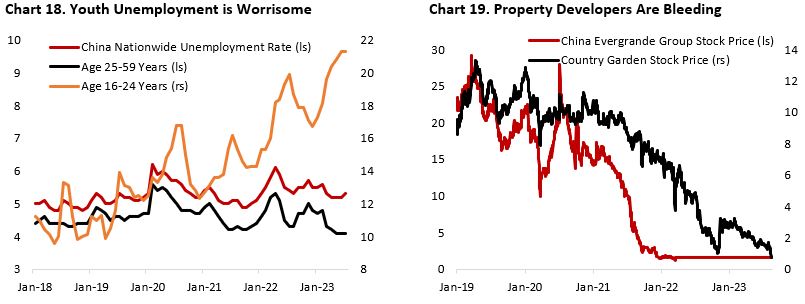 During the whole month of August, the bad news on China seems to be unstoppable. The liquidity and insolvency problem among Chinese property developers have been a drag on consumer sentiment, many of which put a chunk of their savings for a down payment of a house that have yet to be built and may never be built. At the same time, the decision to stop publishing its youth unemployment figure (21% in June) has instead intensified focus on the country’s malaise (Chart 18).