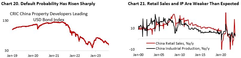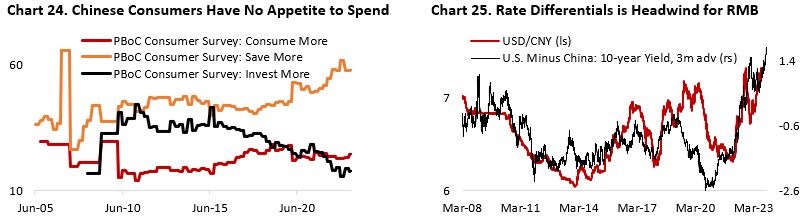 The greater risk for Chinese growth is that liquidity problem arising from property developers’ default could start reverberating to the household sector through the non-payment of wealth products in which many households invested their savings. Although direct investment of these trusts to the property sector is estimated to be only in single digit to low teens, the true exposure could be greater through investment in other categories that are exposed to the sector. The fact that many wealth products stopped paying investment income to its investors despite low stated exposure to the property sector highlights the severity of the issue. Consequently, consumer confidence and willingness to spend will remain low if the underlying problem – weak property sector activity and lackluster consumer demand – is unaddressed through greater fiscal support (Chart 24).