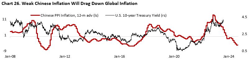 The contrast in macro condition between U.S. and China will continue to be a headwind for Chinese Yuan against the dollar (Chart 25). The better-than-expected growth and tight monetary policy in the U.S. will support yields at a high level, whereas weak Chinese growth and PBoC’s easing effort to reflate its economy will weigh on the yuan – potentially stoking policymakers’ fear of capital outflow. Weak Chinese growth and deflationary trend in Chinese PPI inflation should also cap the upside risk of U.S. treasury yields through downward price pressure on U.S. goods import prices (Chart 26).