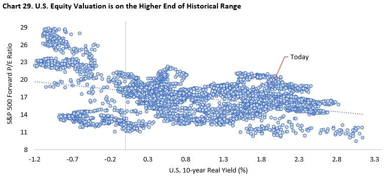 Given our negative view on U.S. consumers’ health and China’s deflationary tendency, we maintain our defensive positioning with overweight position in Treasury bonds and underweight equities and real assets. Despite recent pullback in U.S. stocks, we believe current valuation is nowhere close to fair value, let alone undervalued, at the index level. The rise in nominal bond yield to above 4% – more than a decade high – presents a very attractive opportunities for investors to lock in yields for the long term if investors could weather the near-term volatility (Chart 27). On the other hand, the rise in real yield this year has not been followed by derating in U.S. stocks amid the euphoria related to positive development on AI and equity investors underestimating the risk of recession in the next 12 months (Chart 28). Without decline in real yields, we think forward earnings multiple has to move closer to 16x before U.S. stocks turn attractive (Chart 29).