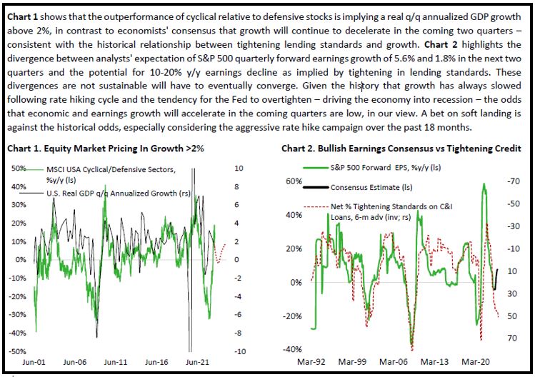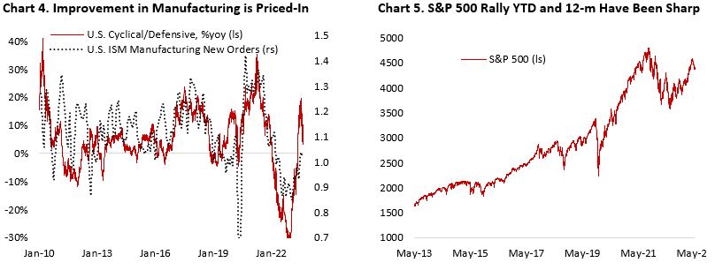 Since then, the equity market has shifted towards defensive footing amid higher yields (Chart 4 and 5), although this is driven more by fear that a too strong U.S. economy could force the Fed to deliver more rate hikes down the road – similar to what Bank of Canada did following a presumed “pause” in January. This is simply not a central bank’s reaction function that is supportive of a soft-landing scenario. Given our view that growth will continue to slow in Q3 and Q4 and unemployment rate potentially increasing to above 5% in the coming 2-3 quarters, we remain defensive in our equity allocation and believe that the reward of holding long-term bonds outweighs the risk of further potential rise in yields.