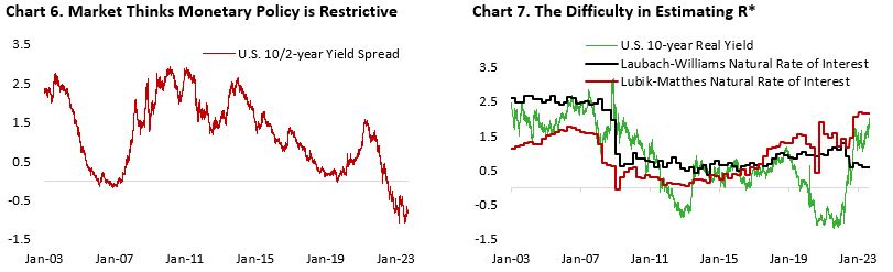 Fed Chairman Jay Powell repeatedly said in his remarks over the previous months that current monetary policy is restrictive. As outlined in June’s Summary of Economic Projection, the Fed believes neutral Fed Funds Rate, the rate that is neither stimulative nor restrictive for the economy, remains at 2.5%. This is also reflected in market participants’ expectation of lower interest rate in the longer run, hence the inverted yield curve (Chart 6). Another way is to look at the estimate of natural rate of interest, which is the real rate that is neither fuels nor restricts growth and inflation. However, estimating this variable is difficult and economists are lacking consensus, with current projection ranging from 0.5% to 2.2% (Chart 7). If the estimate by Laubach and Williams on r* is correct, then we should see rapid deceleration in growth and general macro conditions. But given the fact that U.S. GDP as of Q2/23 is still growing slightly above trend, is r* now much higher as estimated by Richmond Fed (Lubik-Matthes)? Or perhaps the lagged impact of monetary policy has yet to hit the real economy?