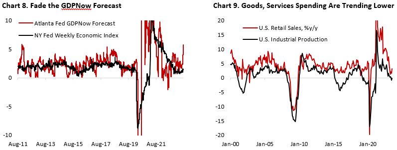 There are several reasons to be suspicious of the ultra-strong GDP estimate by Atlanta Fed that forecast annualized q/q growth of 6% for this quarter. First, the GDPNow forecast is highly volatile and tend to be revised with incoming release of economic data (Chart 8). Compared against New York Fed’s weekly economic index, which also track GDP growth on a real-time basis, the latter is more reliable and consistent in forecasting GDP growth. Although the index accelerated more recently amid the better-than-expected hard data, it remains below the historical trend of 2%. We are on the camp that think that the drag from higher rates is still ahead of us, given the historical 12-24 months lag between rate hike and slowing GDP growth, and believe growth will deteriorate. Chart 9 shows that industrial production growth is already contracting while retail sales are also trending down. The last leg down on consumer spending, which is highly dependent on consumer’s health, will determine whether the U.S. economy will fall into recession.