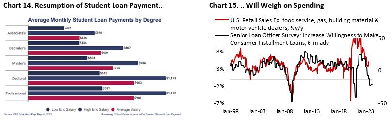 On top of this, the resumption of student loan repayment in October will further strain household finance. The average monthly student loan payment is estimated to be around $503, based on previously recorded average payments and median average salaries among college graduates, according to Student Data Initiative (Chart 14). It is inevitable for consumers to cut on discretionary spending to meet their bills (Chart 15).