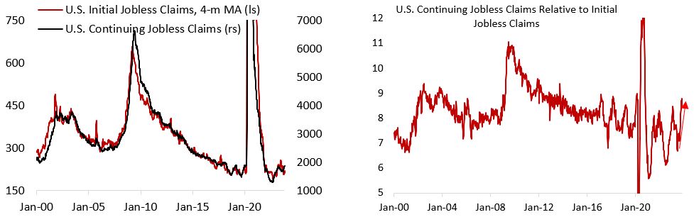 In hindsight, we underestimated the positive growth impulse this year coming from rising government fiscal deficit and the size of households’ excess savings, which support U.S. growth for a bit longer than historically the case. However, going into the new year, global growth forecast is expected to decelerate to below trend next year, while the U.S. labour market is showing more definitive signs of easing. Despite initial jobless claims still hovering near record-low level, the ratio of continuing to initial claims suggest it is taking longer for unemployed individual to find a new job.
