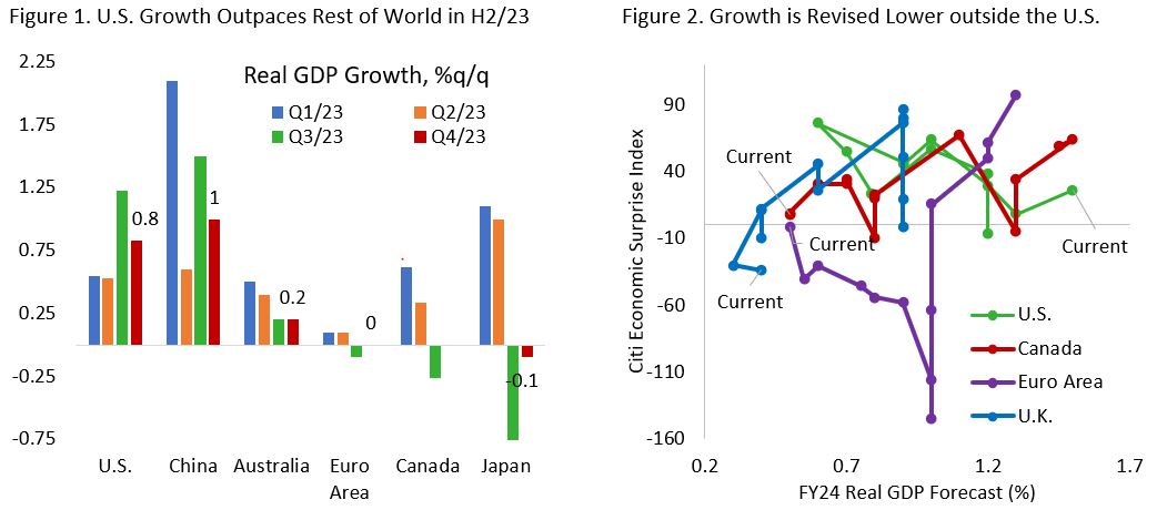 Euro Area managed to avoid technical recession with Q4/23 GDP being flat after a slight contraction in the prior quarter as the region is still reeling from the impact of the war in its Eastern front and higher interest rate. Meanwhile, China, Europe’s second largest export market is in deflation amid lackluster consumer confidence, property sector crisis, and the reluctance of Beijing bailing out local governments. In Canada, strong immigration masked the ongoing recession on a per-capita basis that started few quarters ago. Figure 2 shows that the trajectory of real GDP forecast for this year and economic surprises have been lower in Europe, Canada, U.K., and other major countries, in contrast to the upgrades seen in the U.S.