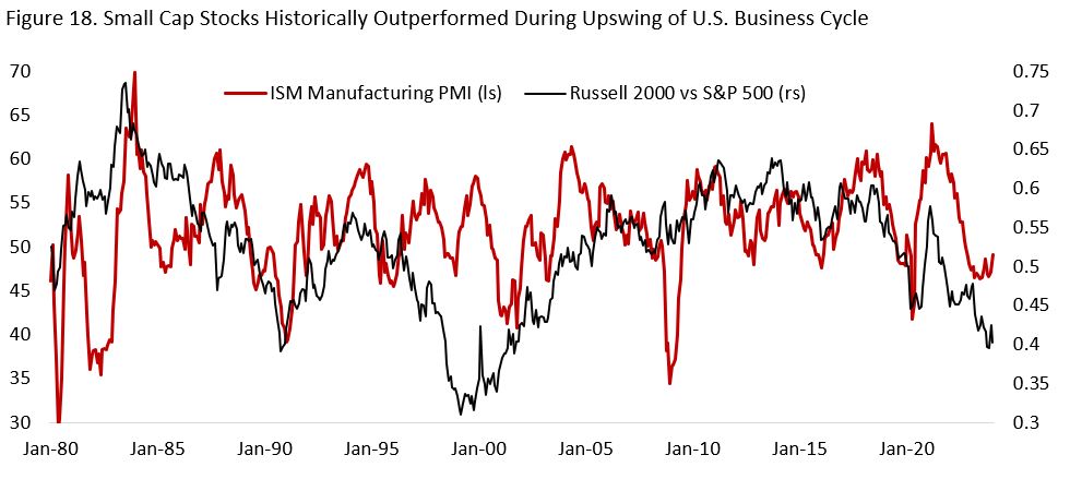 From an equity sector perspective, the strong fiscal incentive to revive U.S. manufacturing sector should support cyclical sectors, especially industrials. The risk/reward of going overweigh in small cap stocks is also becoming more appealing, as they historically outperformed during period of business cycle upswing and looser monetary policy, which may be in the card as soon as the next quarter (Figure 18). Remain underweight banks amid the potential unknown unknown risk from their exposure to commercial real estate and rising U.S. consumer credit delinquency.