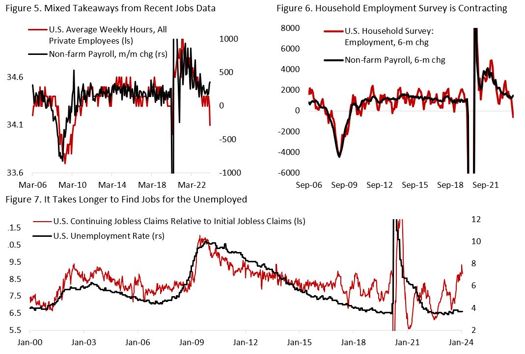 Exceptional U.S. growth continues to be seen in the last quarter of 2023 and beginning of this year, with Q4/23 reading shows the U.S. economy expanding 0.8% q/q (3.2% annualized), slightly higher than the 2% trend growth observed over the past two decades, while the rest of the world lagging. The Euro Area, Canada, and Japan all saw their economy contracting in the third quarter last year, and consensus is expecting growth in these regions to remain weak in Q4/23 (Figure 1).
