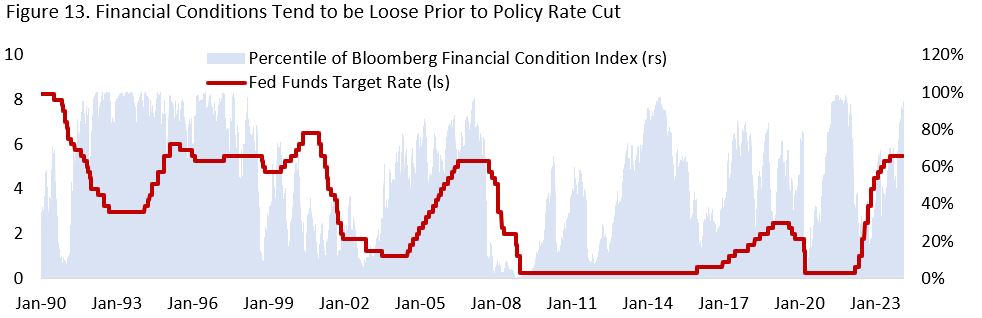 Many strategists are also pointing to a looser financial condition observed over the past five months as an argument that the current policy rate is not restrictive enough for the U.S. economy. But this misses the fact that looser financial conditions have historically coincided increase in Fed Funds rate (Figure 13), prior to it tightening abruptly as a result of financial accident, a burst of bubble, or growth slowing down materially as the lagged impact of monetary policy materializes 12-24 months following the increase in policy rate, as historically had been the case. In short, the longer the Fed holds interest rate at current level, the higher the risk to financial market, although the cushion for the U.S. economy is thicker this time, as discussed below.