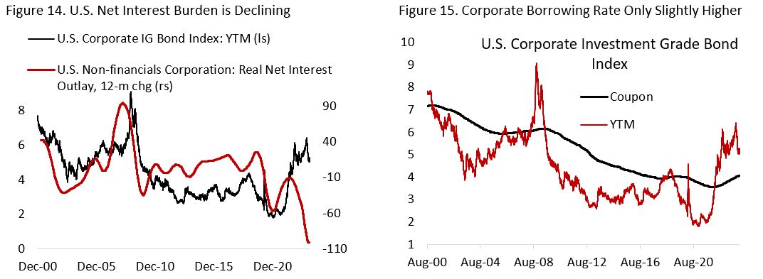 We are sympathetic to the view that in the current cycle monetary-policy impact has been relatively muted amid households and corporations already refinanced at record-low interest rates during the pandemic. Figure 14 shows that despite the 5.25-percentage-point hike in the fed funds target rate, and the increase in yield to maturity, the average coupon paid by mortgage and corporate borrowers have barely risen. In fact, the net interest paid by U.S. non-financial firms has been sharply declining, as a result of the low borrowing rate and high cash balances among U.S. corporations. As time goes by, U.S. non-financial corporations will eventually refinance their borrowing and face higher rates. But in the near term, the higher borrowing rate is not a meaningful headwind for their financial position (Figure 15).