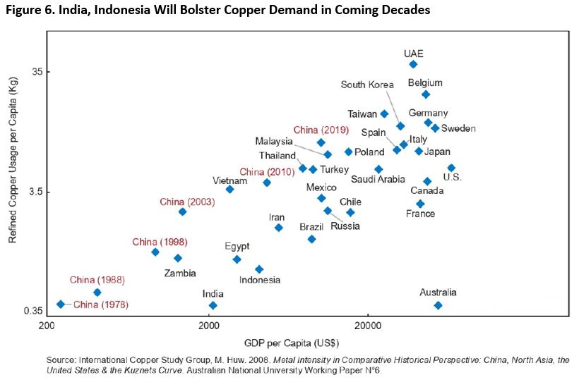 For the reason mentioned in our opening paragraph, we prefer to play the potential bull market in commodities through the exposure of base metal, especially copper. EM Asian countries such as India and Indonesia continue to grow at a rate above 5%, with both government focus on infrastructure building, which will be the source of structural demand growth in the coming two decades. Consider that between 2000 and 2013, China’s annual copper demand quadrupled (Figure 6). Today, India and ASEAN’s consumption of refined copper amounts to 700k and 840k ton per year, respectively. Even if emerging Asian countries’ consumption of refined copper only doubled in the coming decade- half those of China – this will amount to an addition of 1.5 million ton in annual demand (5.7% of refined copper annual consumption today). This is not yet accounting for the consumption growth in developed countries and tailwinds from the transition towards renewable energy, where an electric vehicle requiring 3-4 times the amount of copper compared to internal combustion engine vehicle. The bottom line is that refined copper demand will continue to grow above 2.5% annually for the foreseeable future.