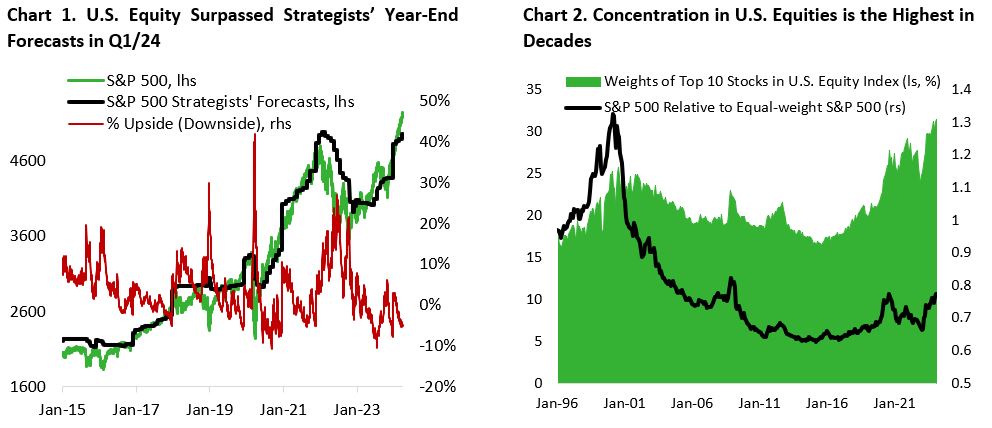 Following the bottom in October 2023, the U.S. equity market has entered another bull market as it rose over 25% in a span of less than six months, trouncing the performance of Canadian and international equity market, which gained 17% and 21%, respectively. The steady climb higher in equities has also been relatively painless, with pace and volatility that surprised many. Sell side strategists were forced to raise their year-end target higher as the S&P 500 surpassed most strategists’ target even before the quarter ended (Chart 1), while the VIX index stayed below 16 in Q1/24.