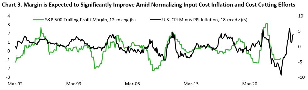 There are, however, reasons to be optimistic. First, raw material cost and wage inflation have been declining, which should translate to lower input and operational cost for many companies. Second, companies have been proactive in improving operational efficiency through cost cutting efforts and trimming some of their workforce, which is also a tailwind for profit margin (Chart 3). Third, the price hikes done over the past three years have not translated to material reduction in volume, mainly because wages have risen alongside CPI inflation, excess savings have been drained only among households in the 0-50th income percentile, and the overall job market remains in a healthy state. In addition, the improving outlook for the manufacturing sector could mean that even if consumer spending weakens further, the cyclical part of U.S. economy could start to pick up – translating to rotation into sectors that experienced significant slowdown and have lagged over the past two years. As the probability of soft landing has increased significantly over the past one year, the outlook for stocks beyond the AI beneficiaries are also improving. For instance, many stocks in the energy, utilities, and consumer staples sectors are trading at valuation below their historical averages and provide an attractive dividend and buyback yield.