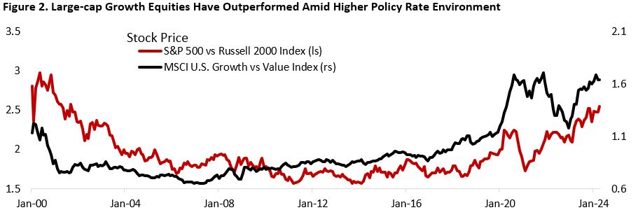 From an equity investor’s lens, a slower descent in policy rate could mean the outperformance of large-cap firms relative to their mid-and-small-cap counterparts should continue going forward, and growth equities should continue to trounce value (Figure 2).
