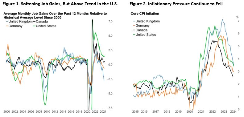 For the past two years, all eyes have been on the timing and pace of policy rate cut. Investors had been whipsawed multiple times as the change in narrative between recession and soft landing translated to high volatility in the fixed income market. With the macroeconomic backdrop in the U.S. still robust while the rest of the world is in a relatively worse place, policymakers outside the U.S. have front run the Federal Reserve in easing monetary policy. Inflation and employment trends have been relatively softer outside the U.S. Job gains for Britain and Germany have already fallen to below the historical average (Figure 1), while those of Canada has declined to around trend – although the gain in Canadian job markets have been dominated by part-time rather than full-time position. Inflation, while remaining above central banks’ target, have behaved better in recent months and leading indicators continue to be favourable (Figure 2). Despite pocket of weaknesses, such as in the continuation of crisis in developed world and China’s real estate market, and U.S. regional banks, the global economy is in a better-than-expected shape in face of high interest rate.