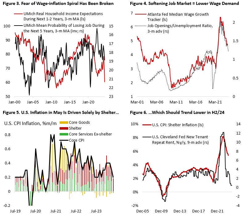 The good news is that there are signs that the inflation-wage spiral has been broken, as highlighted by wage expectations and actual wage growth drifted significantly lower (Figure 3 and 4). A slowdown in growth and softer job market is curbing the bargaining power of workers. Inflation, while still above policymakers’ target, is also not reaccelerating. In fact, U.S. core inflation in May is fully contributed by shelter inflation, with the month-on-month inflation on goods and service ex-shelter prices being flat (Figure 5). Given that leading indicators for shelter continue to point to a softening trend (Figure 6), we could expect continued progress on inflation, barring any surprise from energy and food prices.