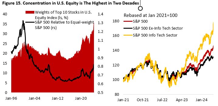 The manufacturing and broader industrial sector should also continue to stabilize in the second half of 2024, with the positive impact from looser monetary policy likely being offset by slower U.S. economic growth. This could be a replay of the late 1990’s playbook where decent U.S. economic growth stand in contrast to those outside the U.S., and the U.S. financial system itself was under stress from the blow up of LTCM – a hedge fund exposed to the defaulting Russian debt market – giving reasons for the Fed to ease monetary policy. This led to a brief recovery of the manufacturing sector up until the burst of the tech bubble in early 2000. The lack of broad recovery across various sectors of the economy, however, translated to an increasingly concentrated equity market with few winners (Figure 9). Sounds familiar?
