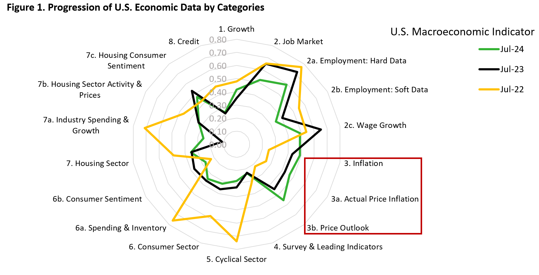 All these are summarized in Figure 1. Except for inflation, all categories have shrunk compared to in July 2023 and 2022. This reflects the improvement in inflation (lower) amid decelerating growth across U.S. economic sectors. There are several key takeaways.