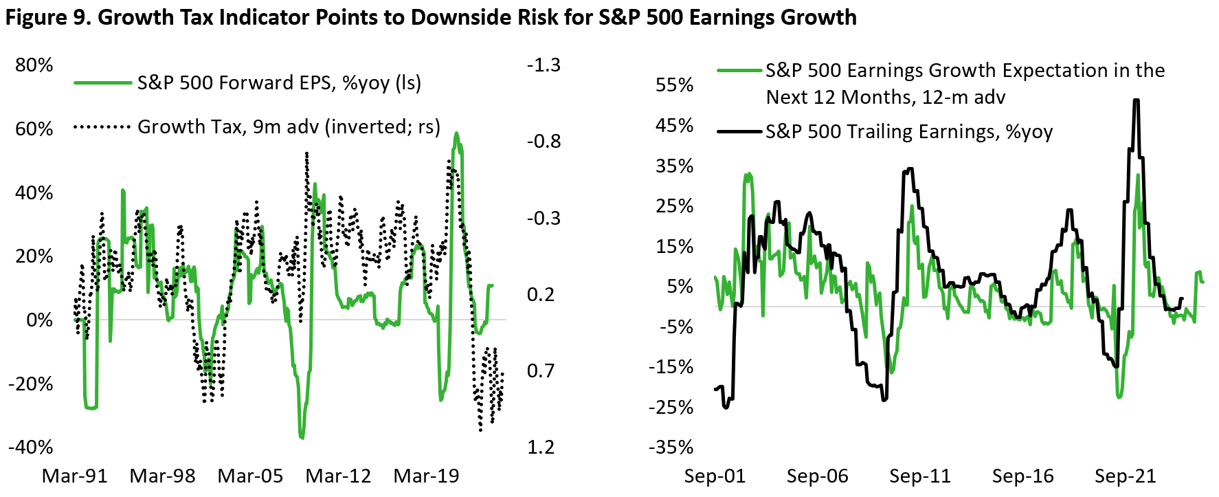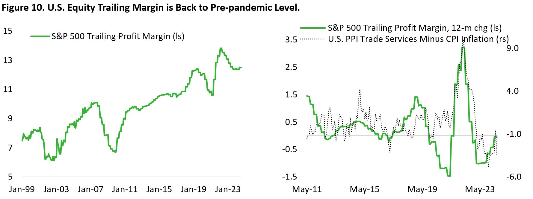 The problem is that there is limited room for margin to further expand from an already elevated level (Figure 10). The trade service category under PPI inflation data – a proxy of margins received by wholesalers and retailers – shows aggregate margin pressure by wholesaler and retailer that begun in mid-2023. Simply put, the outlook of lower revenue growth and limited room for margin expansion makes the current expectation of 14% earnings growth next year very lofty indeed.