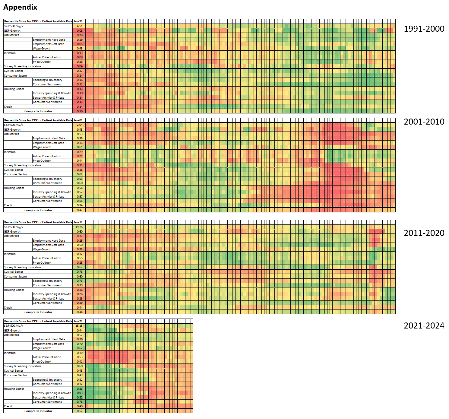 This month we are introducing an enhanced U.S. macro monitor based on all 119 release of U.S. economic data on either monthly or quarterly basis (see Appendix for details). Each data point is transformed either into %y/y or %m/m growth, or both, and then transformed into percentile rank versus its own history. We then classified all these data into eight main categories: growth, job market, inflation, survey & leading indicators, cyclical sector, consumer sector, housing sector, and credit. For each category, we divide the classification further into hard and soft data. Consumer sector, for example, is classified into spending & inventory that tracks actual consumer spending and inventories across channels, and consumer sentiment.