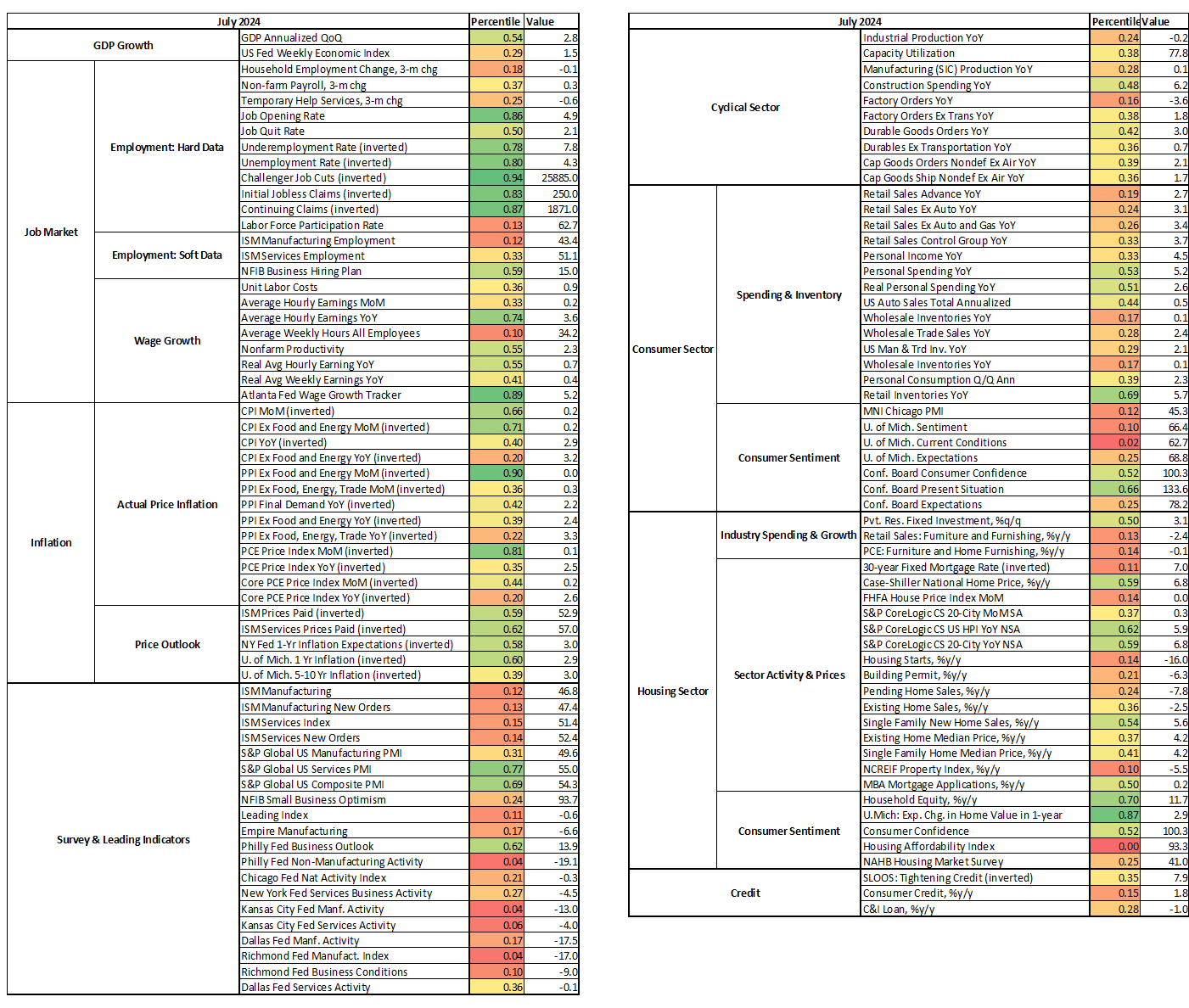 - One area of remaining strength is the job market, which has declined but still at 52nd percentile. Hard data (actual employment) declined from 75th percentile in July 2022 to 72nd percentile in July 2023, and to 59th percentile currently. Note that the softening in hard employment data has been progressing faster over the past year. More worrisome is the outlook for future employment, which has fallen to 34th percentile from 55th percentile two years ago. Wage growth has also moderated to the 49th percentile. It is perhaps unsurprising that Chairman Powell, in a hint that policymakers are ready to begin cutting rates, acknowledged that “the labor market is no longer overheated, and conditions are now less tight than those that prevailed before the pandemic.”
