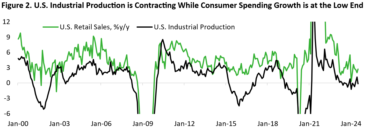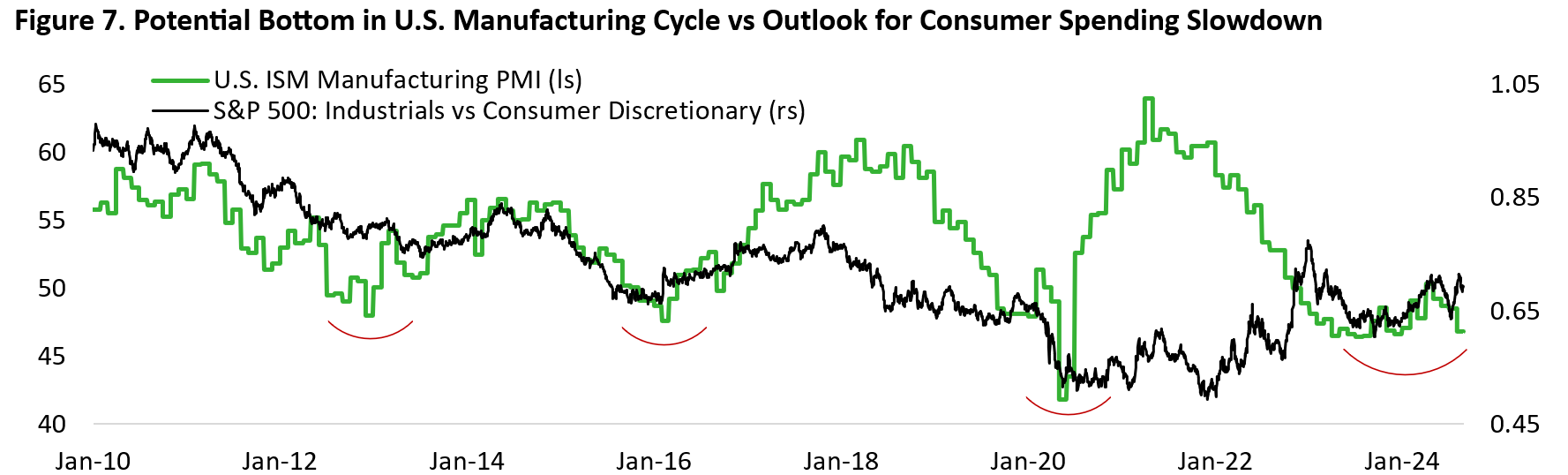 Given the potential recovery of the cyclical/industrial sector from its depressed state and the outlook of continued softening in consumer spending and the labour market, we favour tilting the cyclical basket of our U.S. equity portfolio towards industrials vs consumer discretionary (Figure 7).