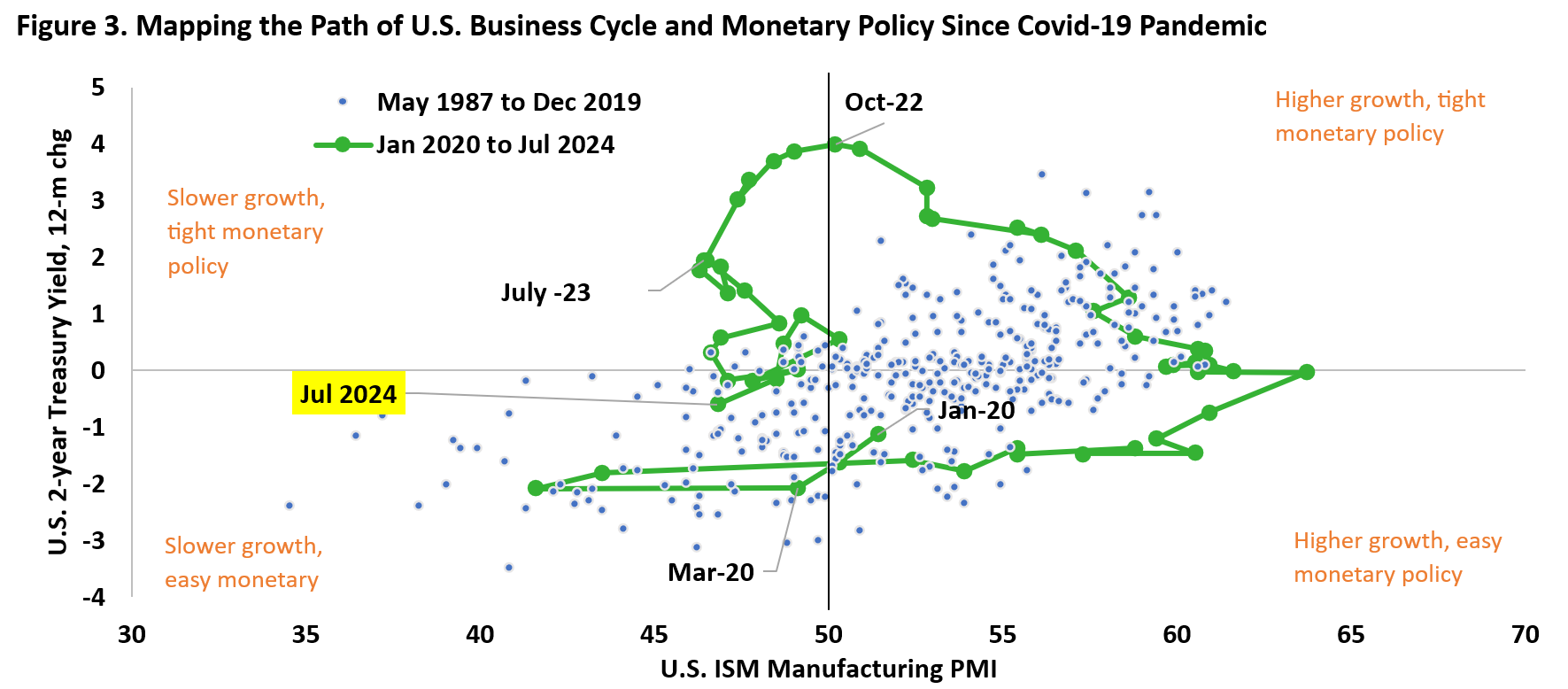 Since the pandemic began, we have gone almost a full circle from the slower growth and easy monetary policy period during the depth of covid-19 lockdown, to the sharp growth recovery in 2021 and most of 2022, and to the growth slowdown that continues today. Figure 3 shows the level of ISM manufacturing PMI, a proxy of the business cycle, and the annual change in U.S. 2-year treasury yield. Between 2021 and 2022, growth accelerated, inflation rose, and monetary policy tightened – all of which bode poorly for bonds. Today, however, we are in period where growth is expected to continue to slow and monetary policy is at the beginning of the easing cycle.
