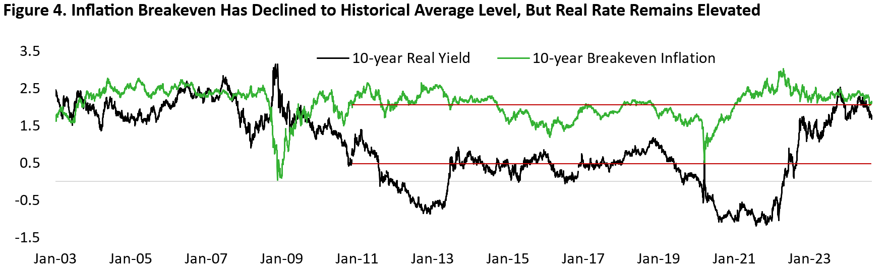 In addition, inflation breakeven has fallen alongside oil prices and consumer income expectation has crashed – both of which indicate the U.S. economy is no longer “hot” and reflect the believe that the job market, not inflation, is the main concerns for investors and policymakers today. With the 10-year breakeven rate at 2.15% today, it is close to the historical average of 2%. Meanwhile, real 10-year yield at 1.67% is still significantly higher than previous decade’s average of 0.5% (Figure 4). One could argue that U.S. economy’s neutral rate has changed since the pandemic, but structural demographic trend and continued global excess savings should still support, if not strengthen the case for lower global yields. We continue to see significant upside for long-term bonds, even in the case where nothing “breaks” in the financial market and the U.S. economy avoided a recession.