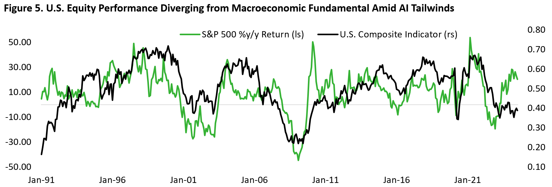 There are reasons why investors should not rule out a harder landing scenario. The yield curve is un-inverting (steepening), alongside rise in consumer expectation minus present situation – historically a decent predictor of U.S. recession. Meanwhile, Conference Board LEI has been contracting for 27 out of 28 months since March 2022 (February 2024 was flat, the only month where it wasn’t negative). Conference Board survey also saw the gap between jobs hard to get minus jobs plentiful continue to rise. Importantly, the majority of revision for jobs gain and retail spending has been to the downside. History shows that the U.S. economy could look strong on the surface up until just few months prior to the NBER recession date. Similarly, unemployment rate tends to rise like a J-curve in the late stage of business cycle that ended with a recession. As Figure 5 shows, the macroeconomic data has been lousy and diverging from the S&P 500 index performance over the past year amid the tailwind from anything AI.