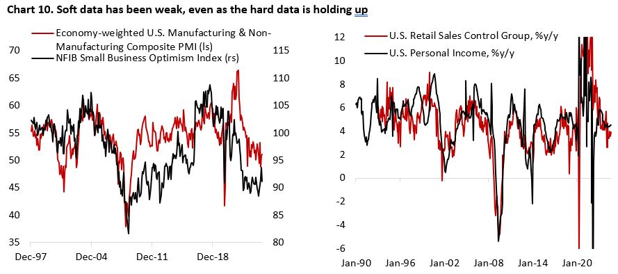 In the housing sector, we are looking for the market to thaw. The impacts of 550 bps policy rate hike and elevated property prices following the pandemic boom are clearly visible across our indicators (Chart 5). Unlike in September 2007, however, the housing sector is in better shape today (39th percentile vs 18th percentile in the Fall of 2007). Mortgage applications and housing transactions have fallen over 70% since the Fed started hiking policy rate in 2022, but house prices have been holding up. A resilient labour market should support the sector to rebound from its current weak condition.