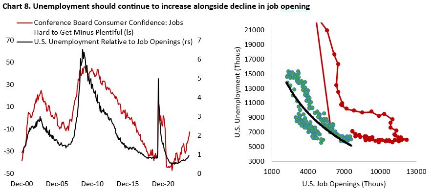 Given the historically leading properties of several soft data on employment, investors are highly attentive to the incoming data, including the monthly release of non-farm payrolls and weekly jobless claims. Conference Board survey highlights that the share of respondent saying jobs are hard to get has been rising sharply since the second quarter of 2024, which historically coincided with a rising trend in unemployment (Chart 8). This is corroborated by the U-6 (underemployment) measure of unemployment rate that continue to rose to 7.9% in August. Fortunately, initial and continuing jobless claims are still at a relatively low level today even as job openings fall.