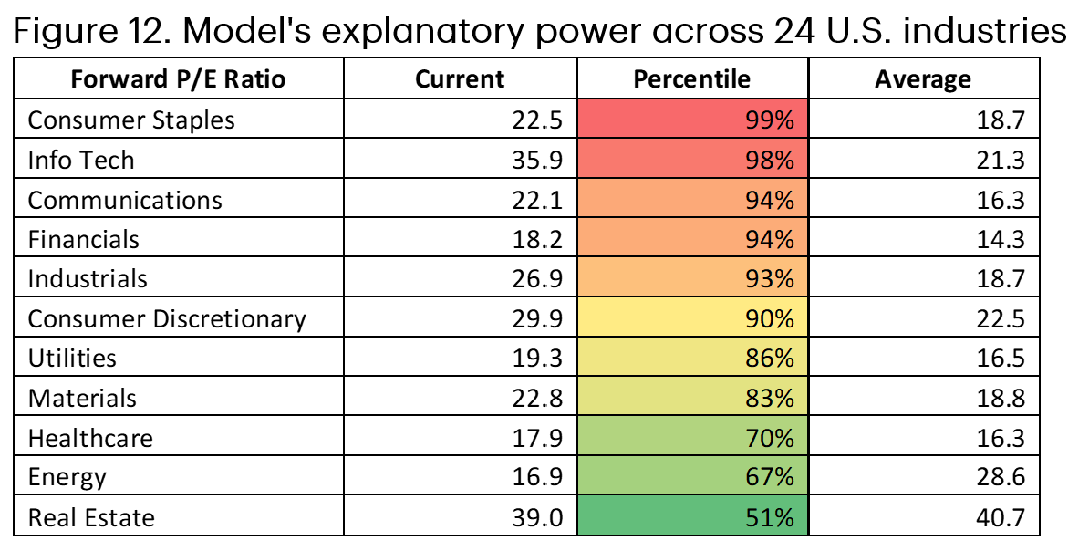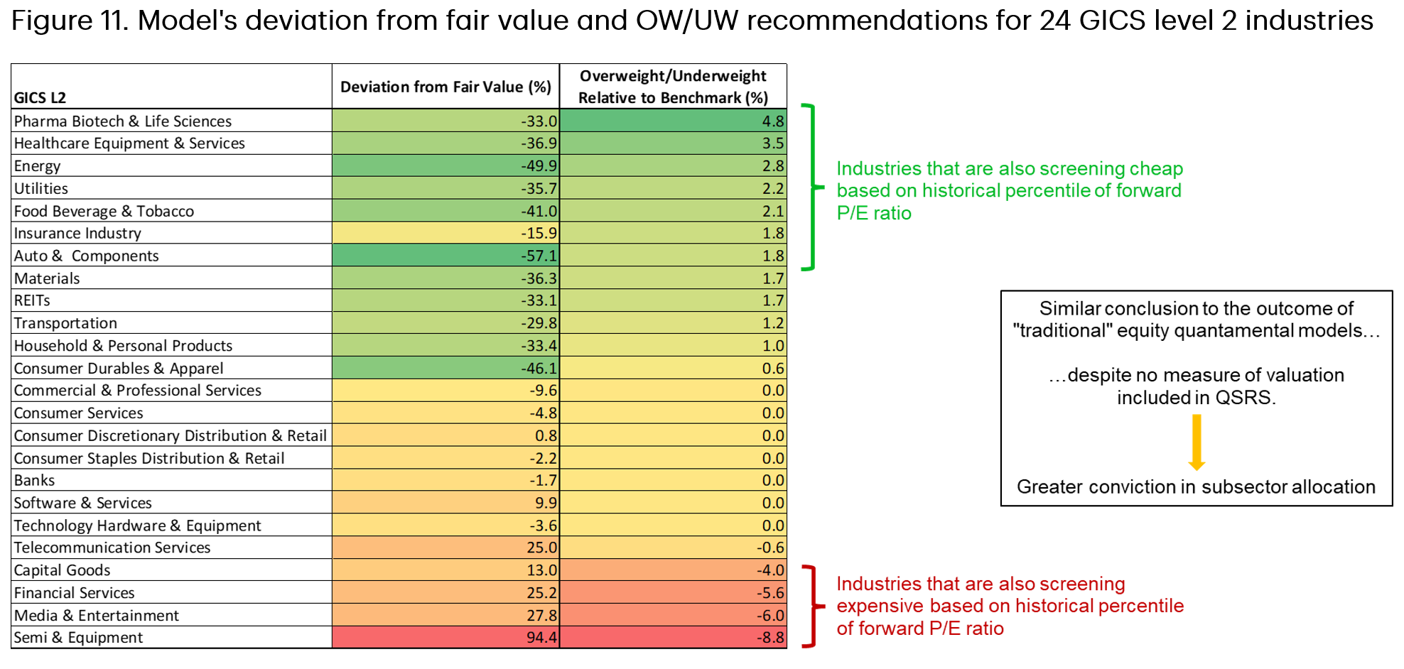 Figure 11 outlines the model’s deviation from fair value and the overweight/underweight recommendations. Healthcare (pharma, biotech & life sciences and healthcare equipment & services), energy, and real estate rank favourably (as of September 2025), at a time when valuation for the sector also screen cheap (Figure 12). This is interesting finding for us given that the QSRS does not utilize any valuation metric as its independent variables. For discretionary managers, the model could help in identifying potentially attractive trade ideas (long stocks in subsectors that screen cheap and short stocks that screen expensive).