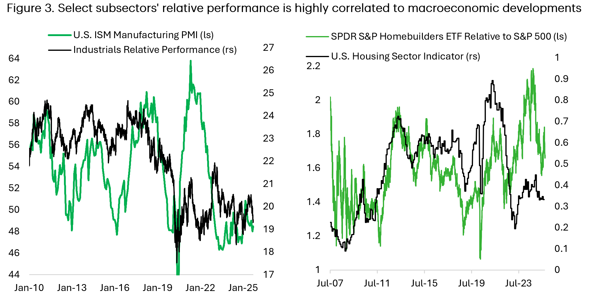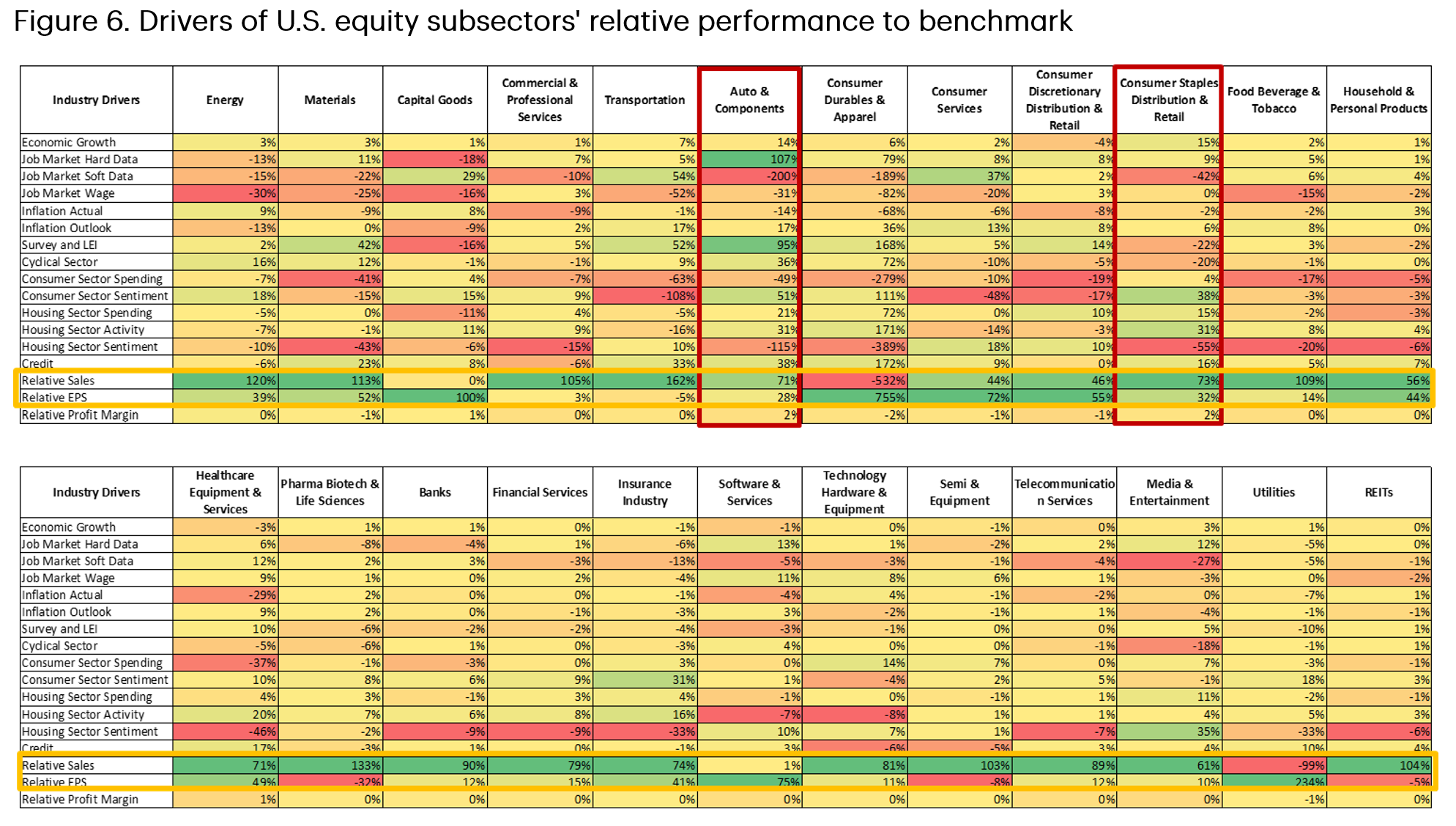 The model highlights that the relative performance of industries such as real estate investment trusts (REITs) and semiconductors & equipment are driven more by equity fundamentals rather than macroeconomic variables, with 81% and 78% of the movement in the subsector, respectively, explained by relative sales and EPS. On the other hand, industries that are more sensitive to the business cycle, such as auto, consumers, and transportation, attributed only 11% to 28% of their relative performance to equity fundamentals.